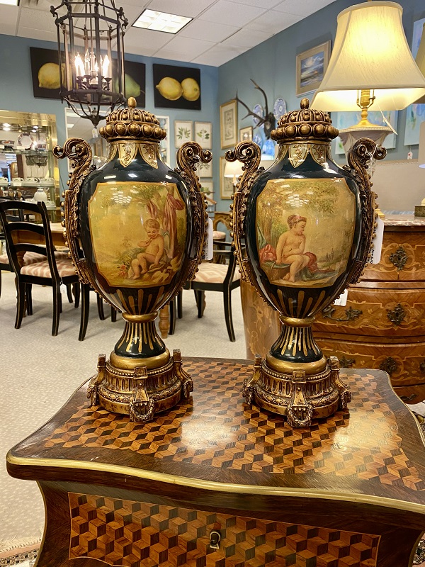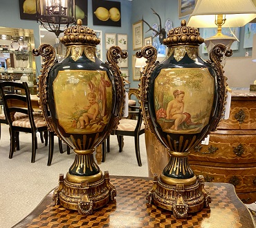 Description: 635403 - Pair of Sevres Style Lidded Urns 7x5x16