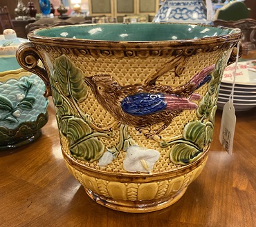 Description: 781825 - Majolica Yellow Bird Cachepot with Handles 9.5x8.5