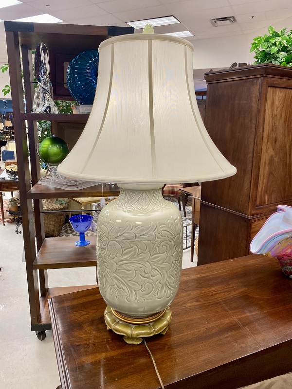 Description: 888111 - Green Floral Relief Wood Lamp 29”